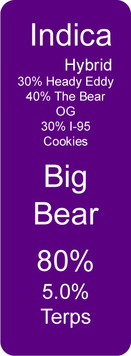 Big Bear (Indica Hybrid) Mar 9 Written By Nicole Sabilia 30% Heady Eddy40% The Bear OG30% I-95 Cookies80% Cannabinoids5.0% Terpenes See the Certificate of Analysis Nicole Sabilia
