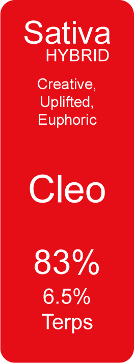 Cleo (Sativa Hybrid) Mar 9 Written By Nicole Sabilia Creative, Uplifted, Euphoric83% Cannabinoids6.5% Terpenes See the Certificate of Analysis Nicole Sabilia