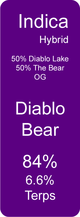 Diablo Bear (Indica Hybrid) Mar 9 Written By Nicole Sabilia 50% Diablo Lake50% The Bear OG84% Cannabinoids6.6% Terpenes See the Certificate of Analysis Nicole Sabilia