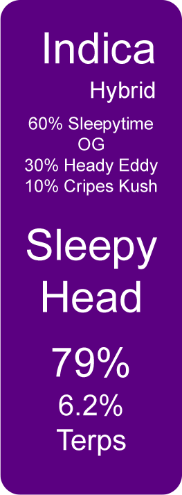 Sleepy Head (Indica Hybrid) Jan 19 Written By Nicole Sabilia 60% Sleepytime OG30% Heady Eddy10% Cripes Kush79% Cannabinoids6.2% Terpenes See the Certificate of Analysis Nicole Sabilia
