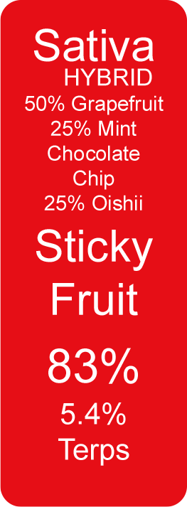 Sticky Fruit (Sativa Hybrid) Jan 19 Written By Nicole Sabilia 50% Grapefruit25% Mint Chocolate Chip25% Oishii83% Cannabinoids5.4% Terpenes See the Certificate of Analysis Nicole Sabilia